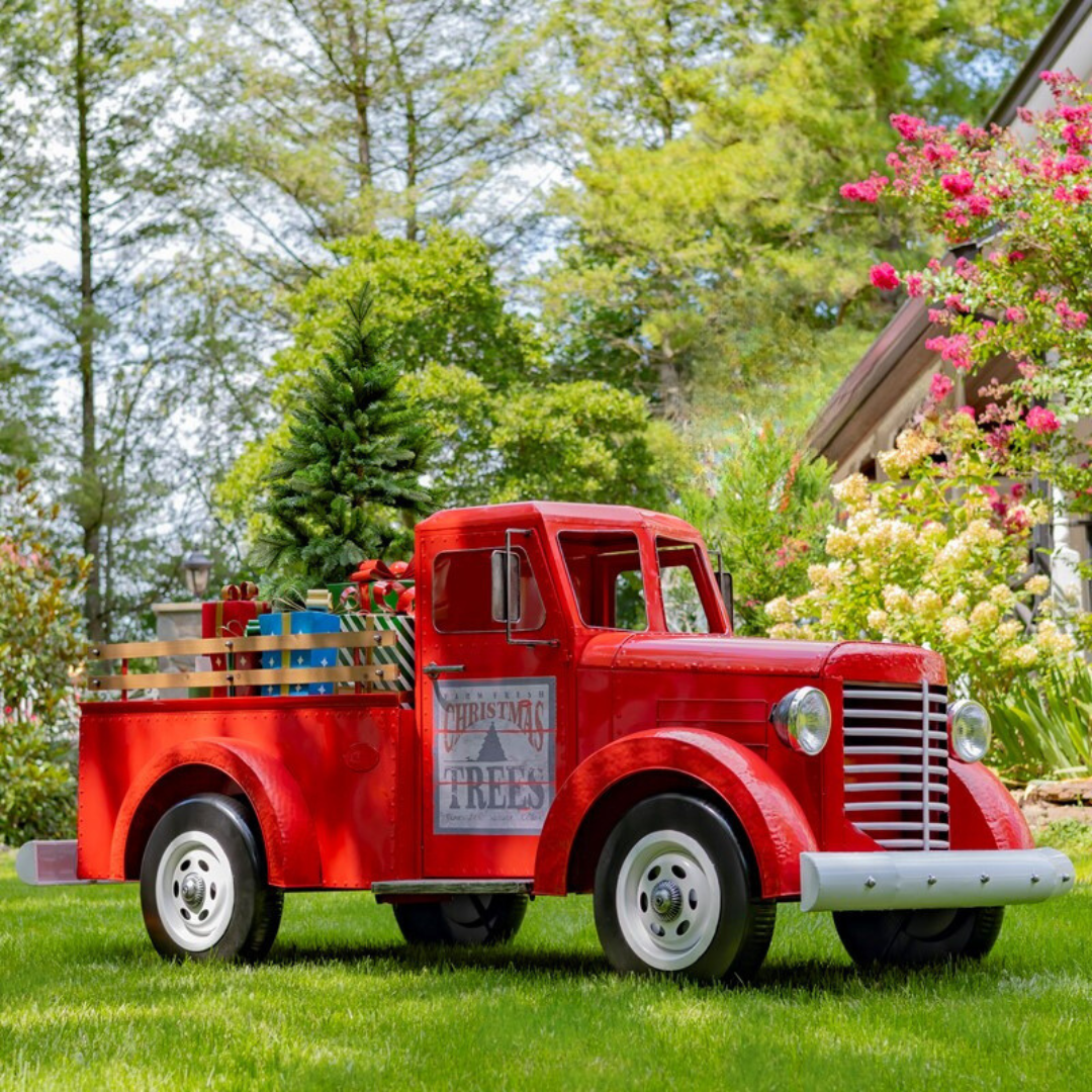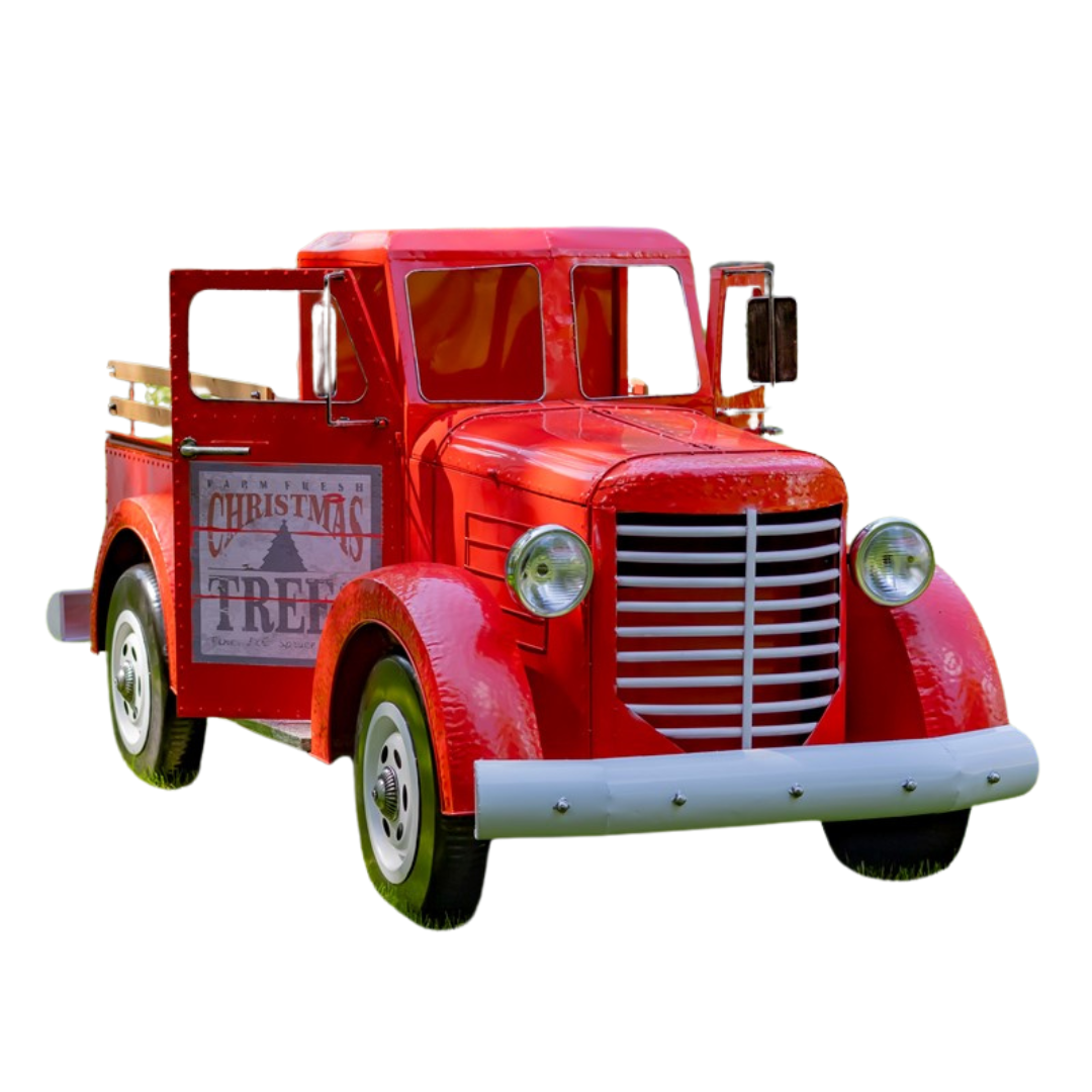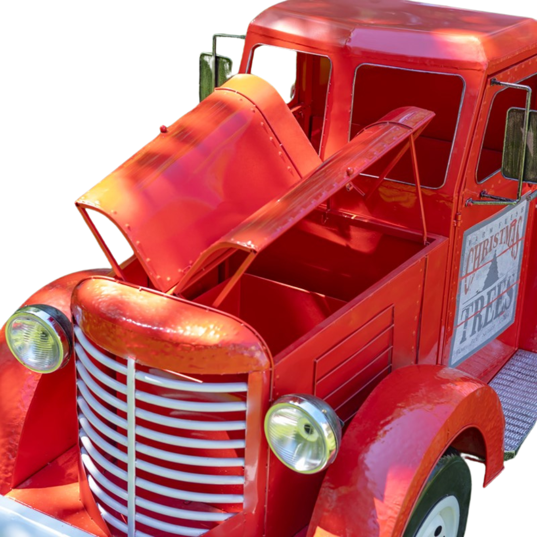 Fabricado con hierro de alta calidad, pintado con acabado rojo brillante y presenta características realistas como espejos laterales, parrilla delantera, neumáticos y faros delanteros que funcionan.